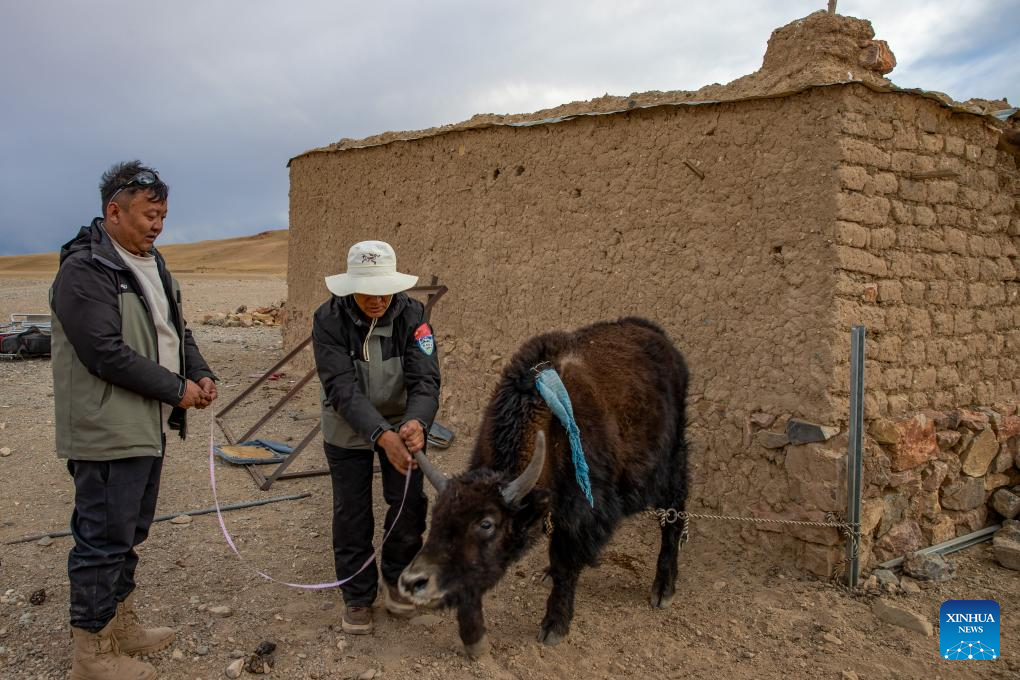 Wildlife conservation officers Gesang Lhundrup (L) and Norbu from Nagqu check the health condition of a wild yak calf at the Changtang National Nature Reserve in southwest China's Xizang Autonomous Region, April 8, 2026. (Xinhua/Jiang Fan)