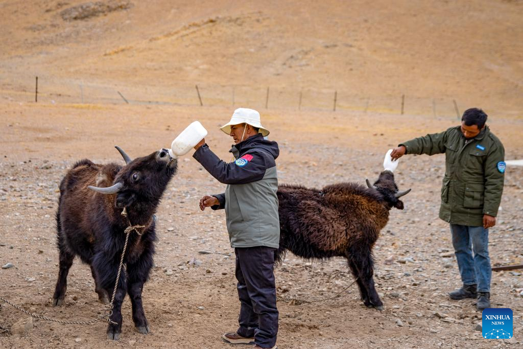 Wildlife conservation officer Norbu (L) and his colleague from Nagqu feed wild yak calves with milk at the Changtang National Nature Reserve in southwest China's Xizang Autonomous Region, April 8, 2026. (Xinhua/Jiang Fan)