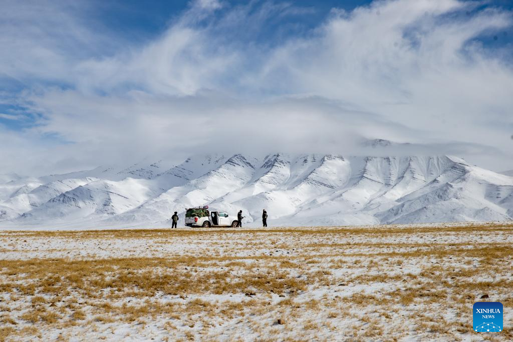 Wildlife conservation officers from Nagqu observe the terrain at the Changtang National Nature Reserve in southwest China's Xizang Autonomous Region, April 9, 2026. (Xinhua/Jiang Fan)