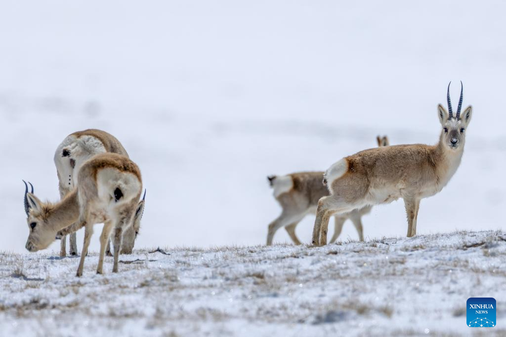 This photo taken on April 10, 2026 shows Tibetan gazelles at the Changtang National Nature Reserve in southwest China's Xizang Autonomous Region. (Xinhua/Jiang Fan)