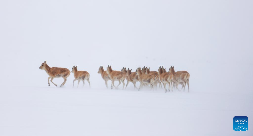 This photo taken on April 12, 2026 shows Tibetan antelopes at the Changtang National Nature Reserve in southwest China's Xizang Autonomous Region. (Xinhua/Jiang Fan)