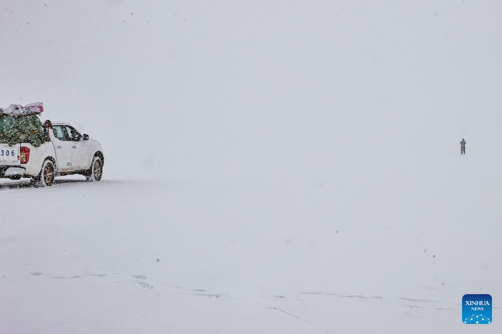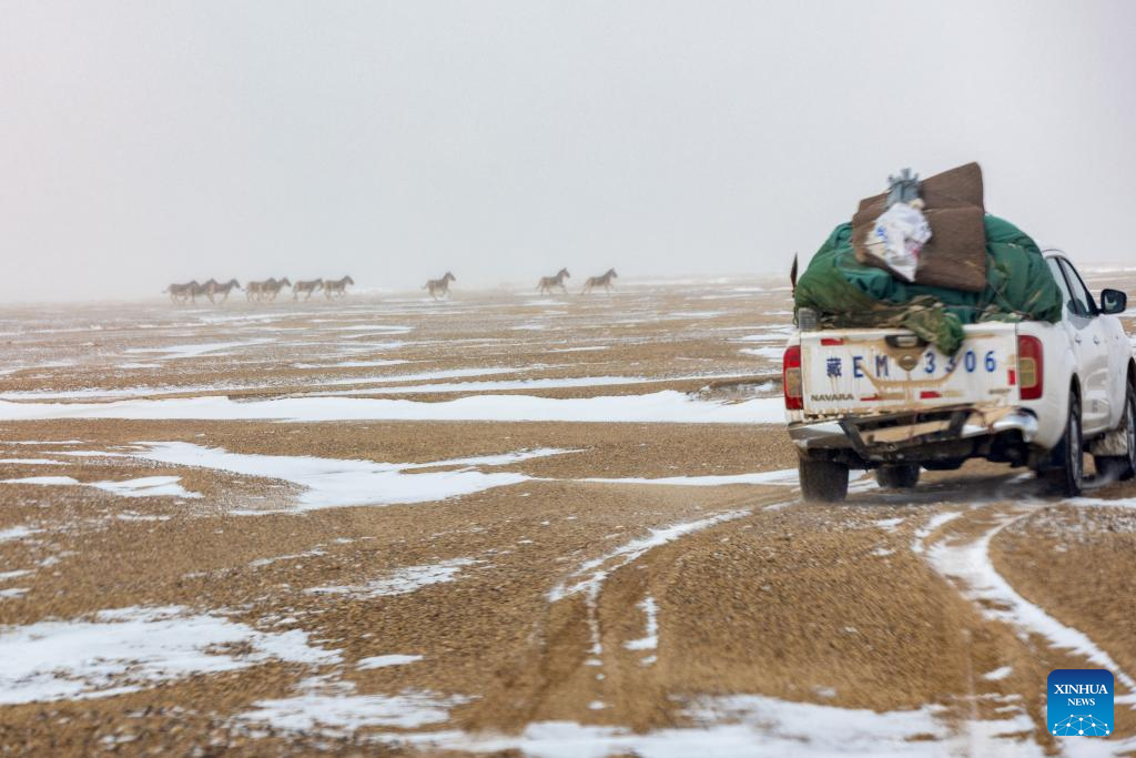 Wildlife conservation officers from Nagqu encounter a heavy snow during a patrol at the Changtang National Nature Reserve in southwest China's Xizang Autonomous Region, April 9, 2026. (Xinhua/Jiang Fan)