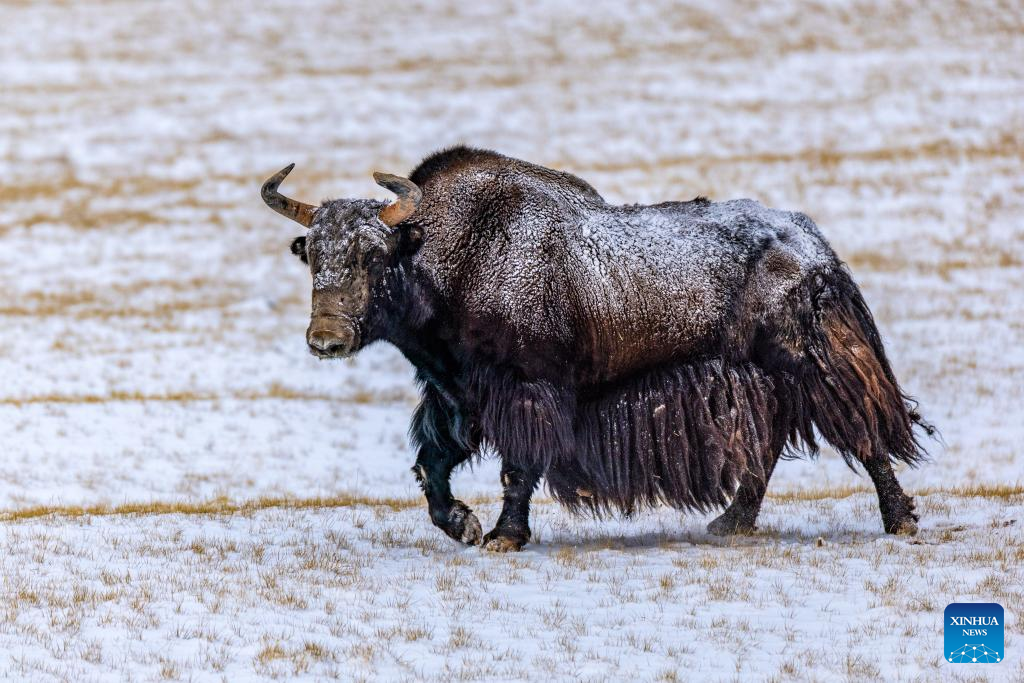 This photo taken on April 9, 2026 shows a wild yak at the Changtang National Nature Reserve in southwest China's Xizang Autonomous Region. (Xinhua/Jiang Fan)