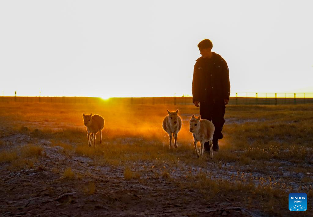 This photo taken on Jan. 13, 2026 shows wildlife conservation officer Doje from Nagqu and Tibetan antelope calves at the Changtang National Nature Reserve in southwest China's Xizang Autonomous Region. (Photo by Gesang Lhundrup/Xinhua)