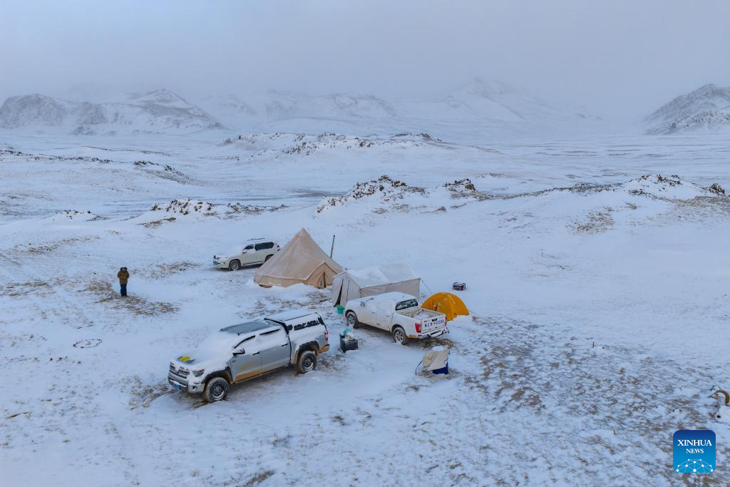A drone photo taken on April 11, 2026 shows the campsite of a patrol team from Nagqu at the Changtang National Nature Reserve in southwest China's Xizang Autonomous Region. Changtang National Nature Reserve, a 4,500-meter-high wilderness in north of Xizang, is dubbed a "paradise for wildlife". It is a refuge for rare wild animals such as Tibetan antelope, wild yaks and Tibetan wild ass, somewhere they can survive and reproduce. The reserve is home to 10 national first-level protected wild animals and 21 national second-level protected wild animals.